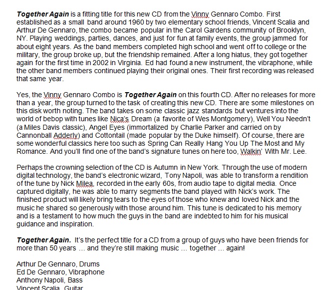 Download Page..... Together Again ...by the Vinny Gennaro Combo